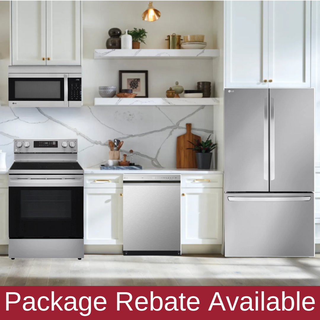 LG 4 Piece Stainless Steel Kitchen Package with French Door Refrigerator, Free Standing Electric Range, Built In Dishwasher, and Over The Range Microwave.Read More