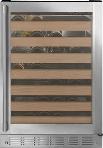 Full-extension sliding wine racks hold up to 57 bottles positioned either horizontally or vertically to maximize space and can be removed for larger bottles. Soft interior LED lighting automatically illuminates when the door is open but can be activated by an internal on/off switch.Read More