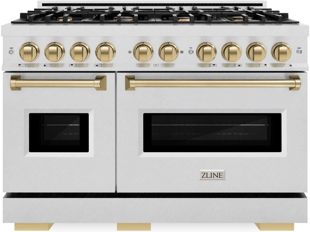 The ZLINE Autograph Edition 48 in. 6.7 cu. ft. Classic Double Oven Dual Fuel Range with 8 Burner Gas Cooktop in Satin Stainless Steel and Champagne Bronze Accents (CDRSZ-48-CB) combines the elegance of a hand-finished porcelain gas cooktop with 8 Italian-made auto-reignition burners, a large electric convection oven with an energy-efficient cooling fan to ensure quiet operation, a small bake-and-broil oven, Landscape oven door window designs, and stunning champagne bronze knobs and handles allowing you to master every meal.